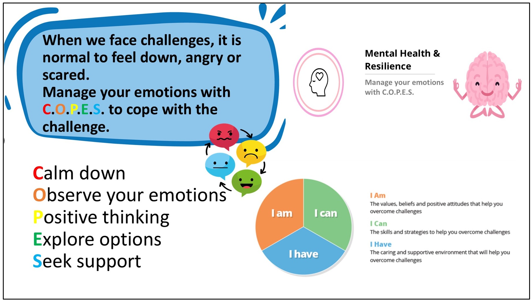 Recognizing emotional challenges as a natural part of growth, we equip students with the C.O.P.E.S. strategy (Calm down, Observe emotions, Positive thinking, Explore options, Seek support) to build resilience and mental wellness.