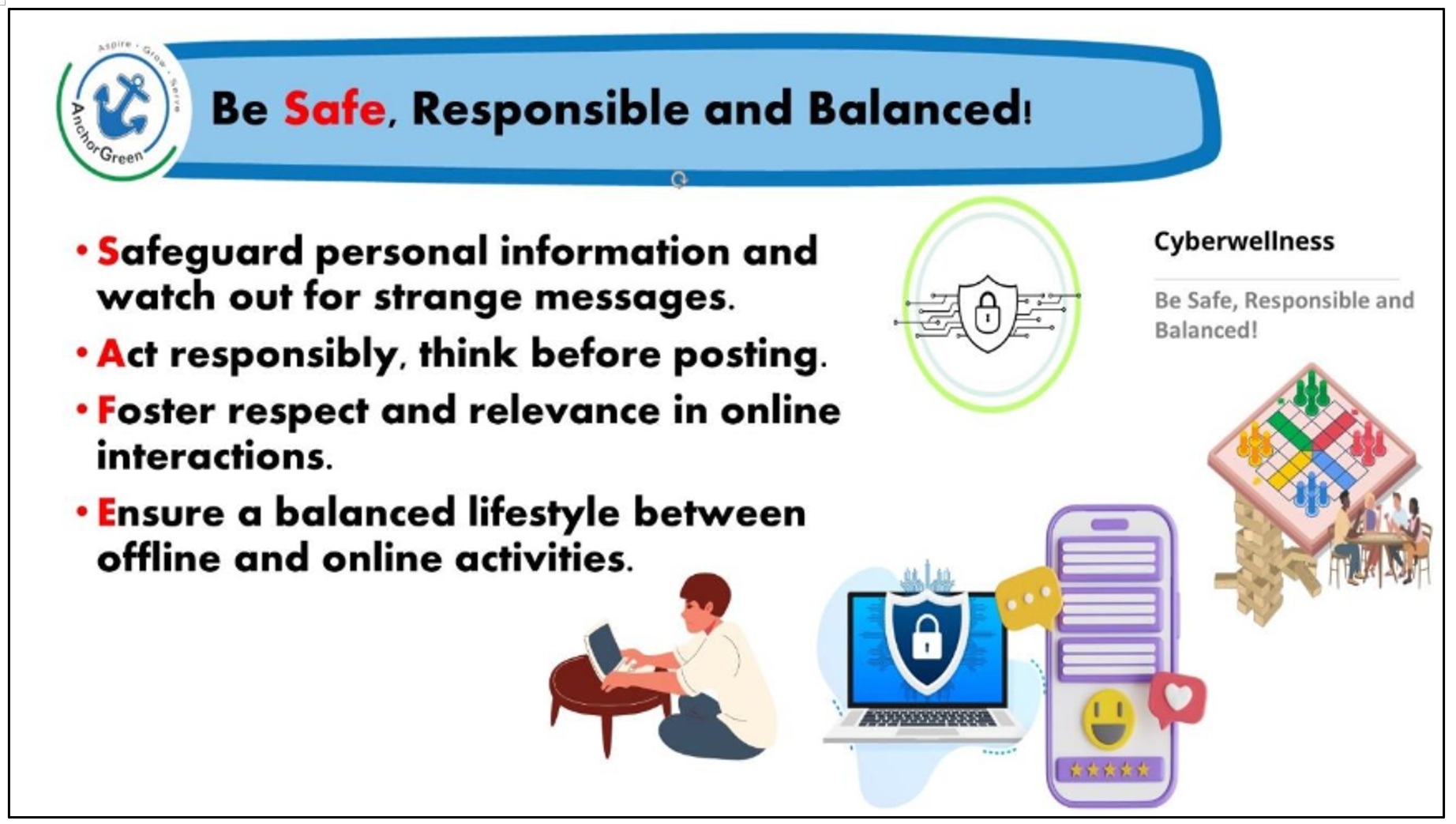Anchor Green Cyber Wellness programme aims to promote the positive well-being of our anchorlites as internet users, inculcates positive peer influence by harnessing technology for collaboration, learning and productivity.
