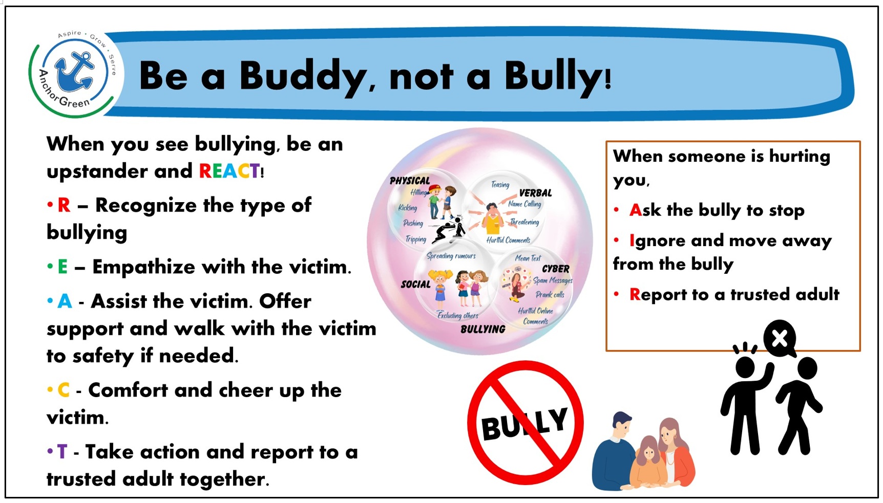 We foster a supportive community through initiatives such as “Be a Buddy, Not a Bully.” Students are encouraged to adopt positive behaviors, recognize bullying, empathize, assist, comfort, and take appropriate action. The “Every Anchorlite is a Peer Supporter” initiative empowers students to cheer their peers, promote acceptance, respect, and speak up against bullying.
