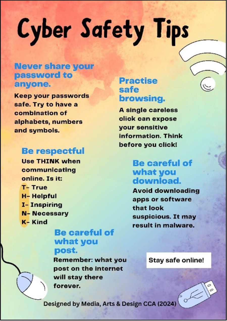 Cyber Wellness (CW) refers to the well-being of our students as they navigate cyberspace. It involves an understanding of the risks of harmful online behaviour, an awareness of how to protect oneself and other Internet users from such behaviour, and a recognition of the power of the Internet to benefit oneself and the community at large.